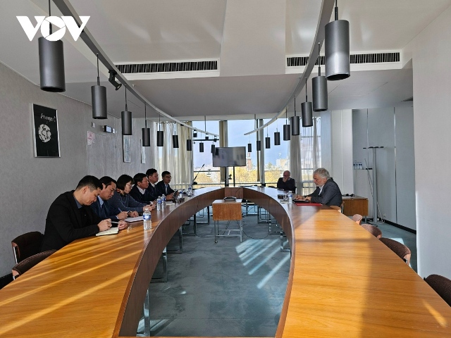 Quang cảnh buổi làm việc giữa Đoàn công tác của Ban Tuyên giáo Trung ương và Ủy viên Bộ Chính trị Đảng Cộng sản Pháp, Taylan Coskun (phải). Ảnh: Anh Tuấn/VOV-Paris |