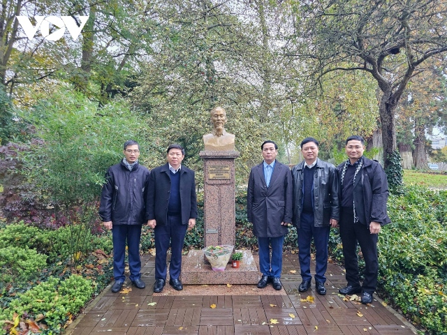 Phó Trưởng Ban Tuyên giáo Trung ương Trần Thanh Lâm (thứ 2, từ trái) cùng các đại biểu tới dâng hoa tượng đài Chủ tịch Hồ Chí Minh tại công viên Montreau. Ảnh: Anh Tuấn/VOV-Paris |