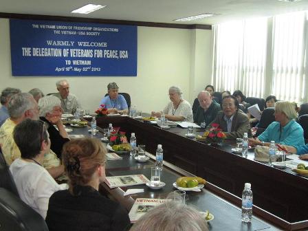 (VOV5) - Từ ngày 18/4 đến 2/5/2013, Liên hiệp các tổ chức hữu nghị Việt Nam đón đoàn 16 người của tổ chức “Cựu chiến binh vì hòa bình” (VFP) sang thăm và làm việc tại Việt Nam. Mục đích chuyến thăm của đoàn nhằm tìm hiểu lịch sử, đất nước, con người Việt Nam, thăm chiến trường xưa, gặp gỡ cựu chiến binh Việt Nam. Đồng thời, đoàn còn tới thăm các nạn nhân và gia đình nạn nhân chất độc da cam, các cơ sở chăm sóc nạn nhân chất độc da cam và làm việc với Hội nạn nhân chất độc da cam tại các địa phương: Hà Nội, Huế, Quảng Trị, Đà Nẵng.