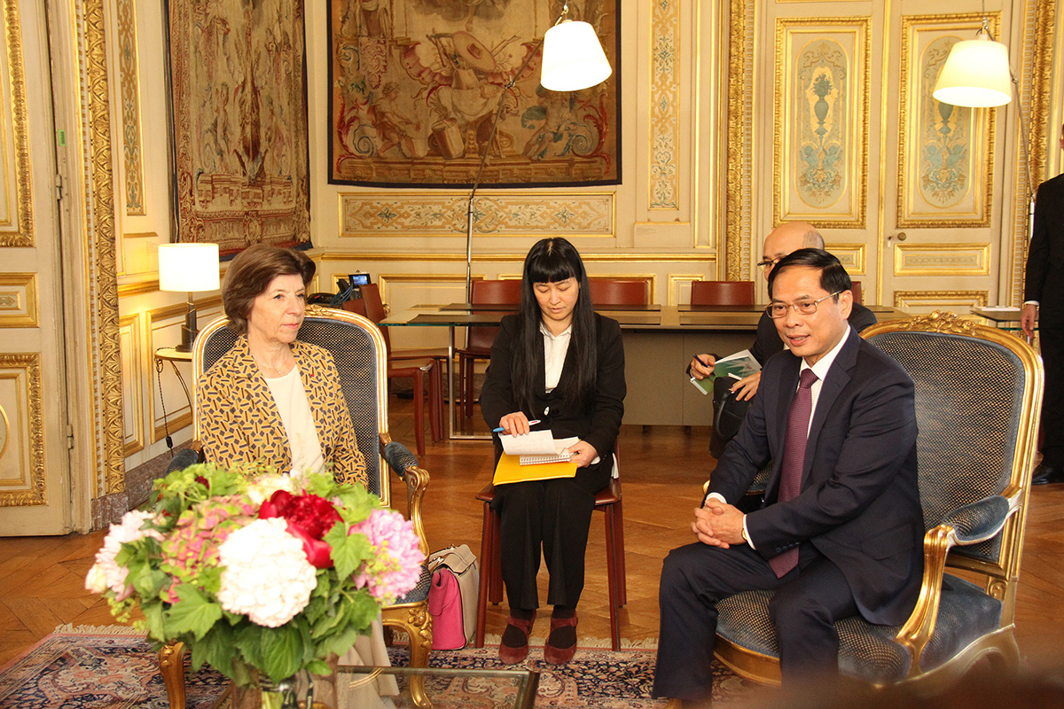 Bộ trưởng châu Âu và Ngoại giao Pháp Catherine Colonna hội đàm với Bộ trưởng Ngoại giao Việt Nam Bùi Thanh Sơn sáng 05/06 tại trụ sở Bộ Ngoại giao Pháp ở thủ đô Paris. Ảnh: Bộ Ngoại giao |