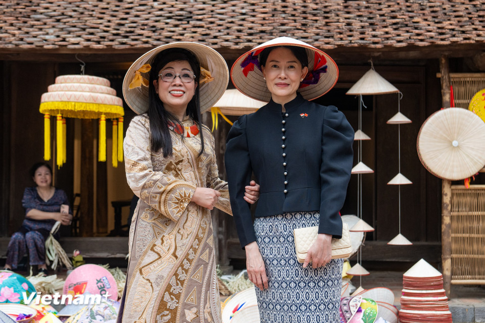 Bà Lê Thị Bích Trân, Phu nhân Thủ tướng Phạm Minh Chính cùng bà Loo Tze Lui, Phu nhân Thủ tướng Cộng hòa Singapore Lawrence Wong đội nón lá chụp ảnh lưu niệm tại Bảo tàng Dân tộc học Việt Nam. Ảnh: Phạm Kiên/TTXVN |