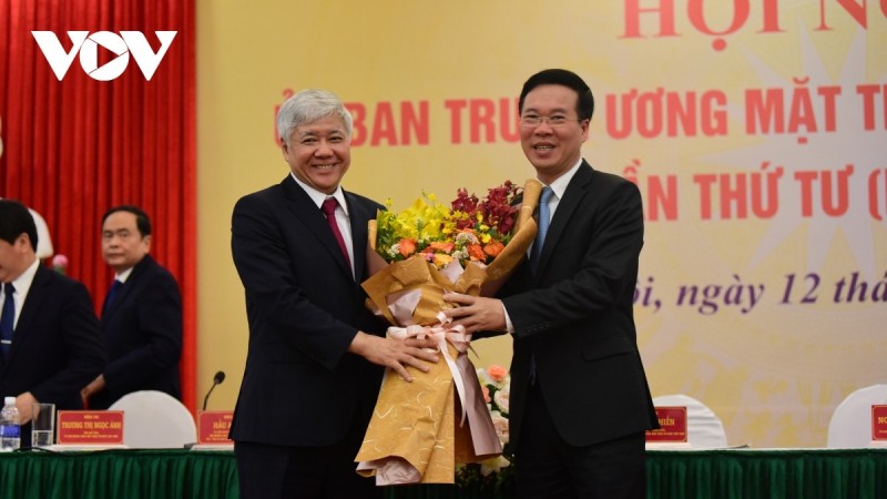 Thường trực Ban Bí Thư Võ Văn Thưởng tặng hoa, chúc mừng tân Chủ tịch Ủy ban Trung ương MTTQ Việt Nam Đỗ Văn Chiến - Ảnh VOV |