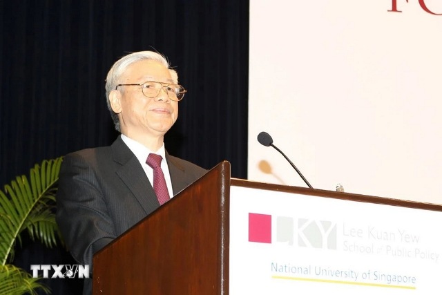 Tổng Bí thư Nguyễn Phú Trọng phát biểu tại Trường Chính sách công Lý Quang Diệu, năm 2012. Ảnh: Trí Dũng/TTXVN |