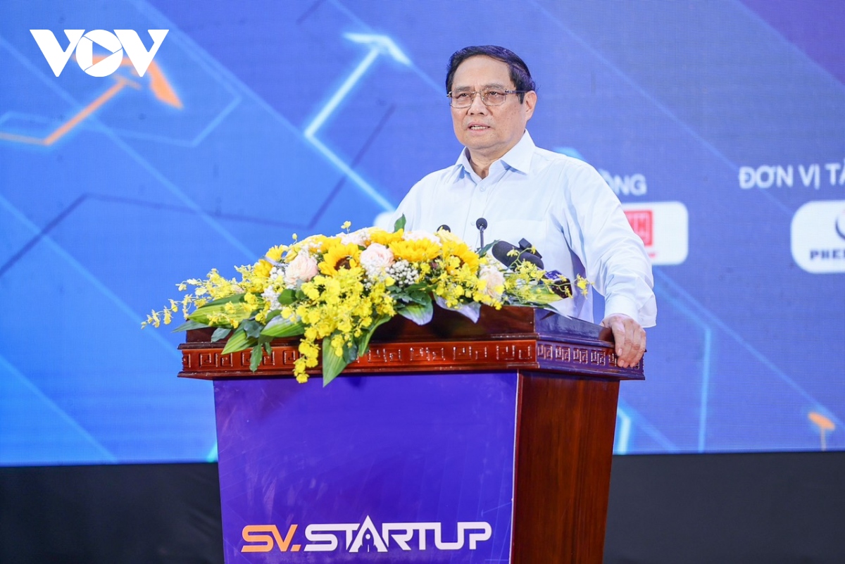 Thủ tướng Chính phủ Phạm Minh Chính phát biểu tại Ngày hội Khởi nghiệp quốc gia của học sinh sinh viên lần thứ 6. Ảnh: VOV |