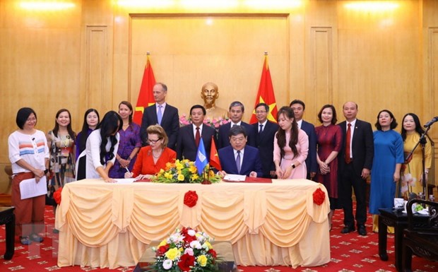 Phó Giám đốc Học viện Chính trị quốc gia Hồ Chí Minh Nguyễn Duy Bắc và bà Caitlin Wiesen, Trưởng Đại diện thường trú UNDP tại Việt Nam ký Biên bản ghi nhớ hợp tác giữa hai bên. Ảnh: Văn Điệp/TTXVN |
