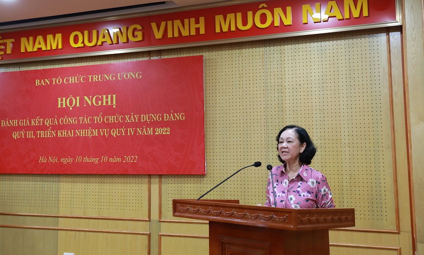 Phát biểu tại đây, bà Trương Thị Mai, Trưởng Ban Tổ chức Trung ương, nhấn mạnh: trong thời gian còn lại của năm 2022, ngành Tổ chức xây dựng Đảng quan tâm thực hiện tốt các nhiệm vụ thường xuyên, chương trình công tác năm 2022 đã đề ra; tham mưu quản lý tổ chức bộ máy, biên chế của hệ thống chính trị; tham mưu thực hiện đồng bộ, chặt chẽ các khâu trong công tác cán bộ; chuẩn bị các hoạt động tổng kết công tác tổ chức xây dựng Đảng năm 2022; xây dựng chương trình công tác năm, kế hoạch kiểm tra, giám sát, khảo sát và tổ chức hội nghị, hội thảo năm 2023.