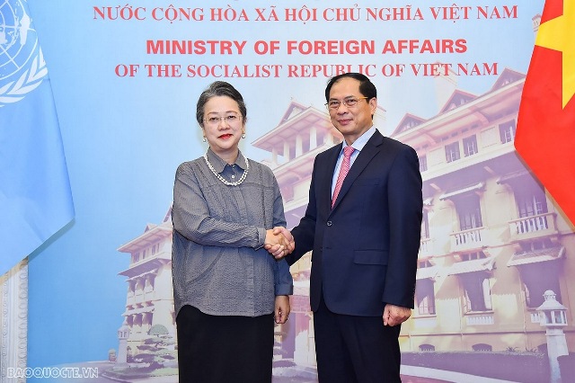 Bộ trưởng Ngoại giao Bùi Thanh Sơn và Phó Tổng thư ký Liên hợp quốc kiêm Thư ký điều hành Ủy ban kinh tế xã hội khu vực châu Á-Thái Bình Dương của Liên hợp quốc (ESCAP) Armida Salsiah Alisjahbana. Ảnh:baoquocte.vn |