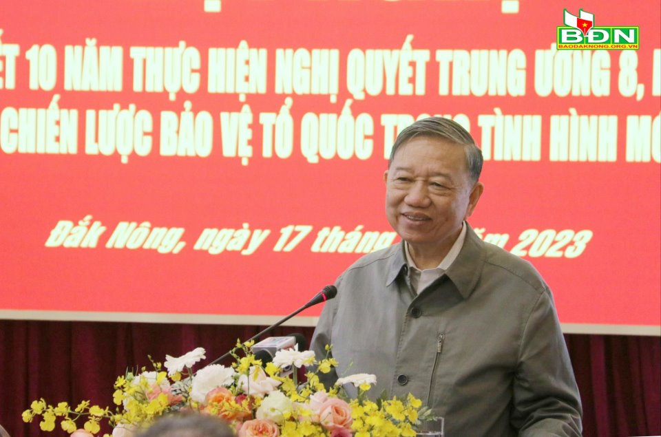 Phát biểu tại Hội nghị, Đại tướng Tô Lâm, Bộ trưởng Bộ Công an, khẳng định Đắk Nông là tỉnh biên giới có vị trí quan trọng về quốc phòng an ninh và nằm trong khu vực chiến lược quốc gia.