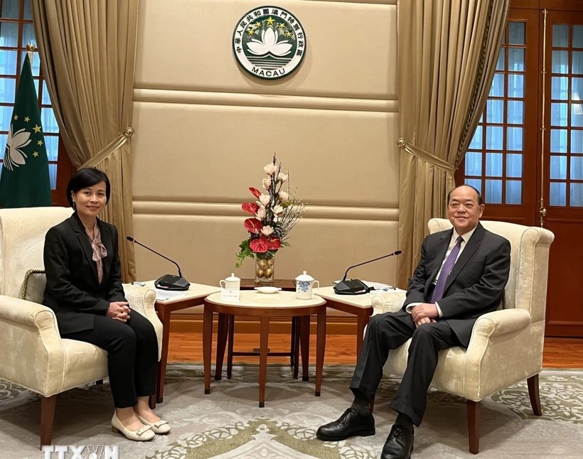 Tổng Lãnh sự Lê Đức Hạnh (trái) và Trưởng Đặc khu hành chính Macau Hạ Nhất Thành tại buổi tiếp - Ảnh: TTXVN |