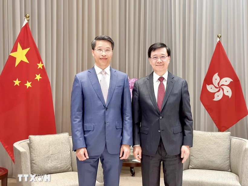 Tổng lãnh sự Phạm Bình Đàm (bên trái) chào từ biệt Trưởng đặc khu hành chính Hong Kong Lý Gia Siêu. Ảnh: TTXVN |