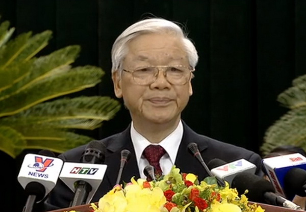 | Tổng bí thư Nguyễn Phú Trọng phát biểu tại phiên khai mạc Đại hội - Ảnh chụp màn hình HTV. |