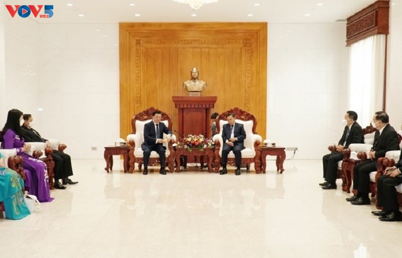 Tổng Bí thư, Chủ tịch nước Lào Thongloun Sisoulith tiếp Bí thư Thành ủy Hà Nội Đinh Tiến Dũng. Ảnh: PV VOV tại Lào |