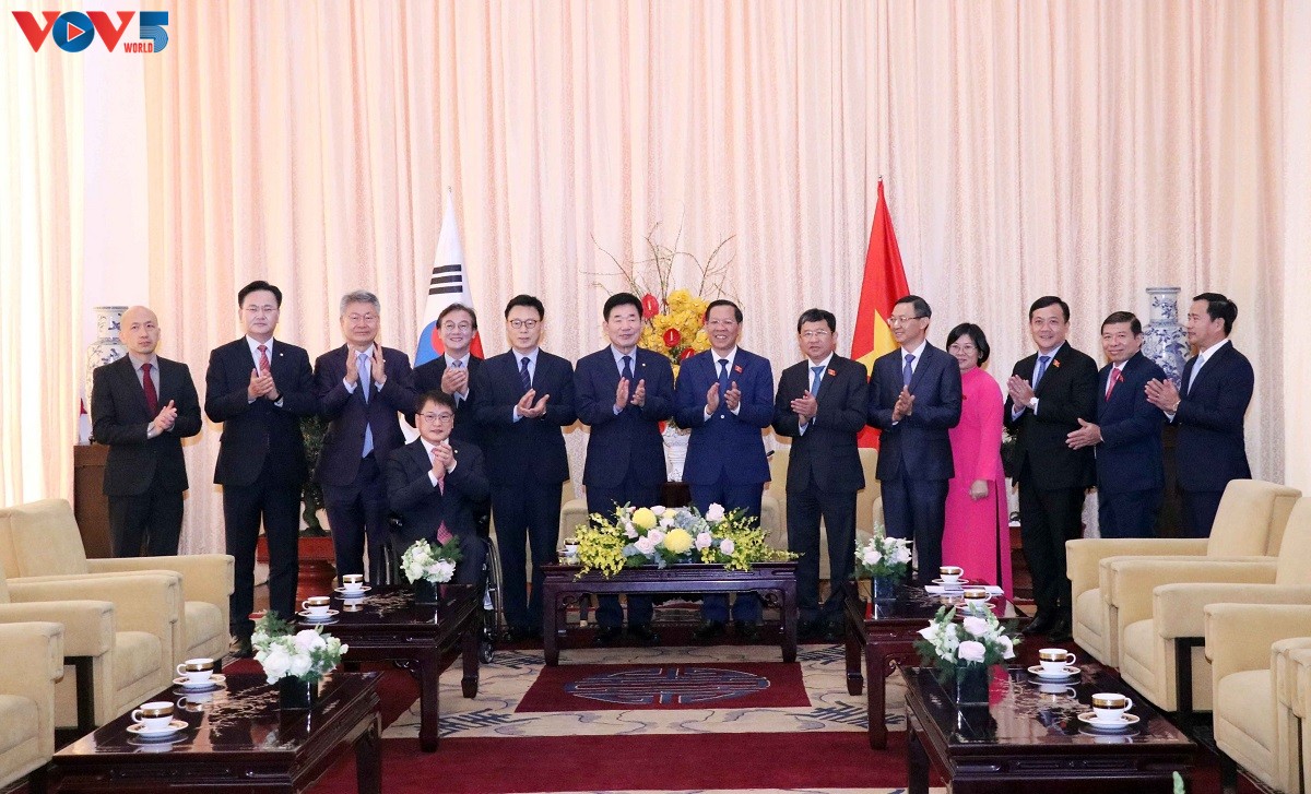 Đoàn đại biểu Quốc hội Hàn Quốc và lãnh đạo TP.HCM chụp ảnh lưu niệm. Ảnh: X.K/VOV |