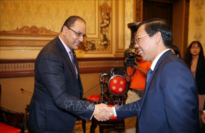 Ông Phan Văn Mãi (phải), Chủ tịch UBND Thành phố Hồ Chí Minh tiếp Giáo sư Slim Khalbous (trái), Tổng Giám đốc Tổ chức Đại học Pháp ngữ. Ảnh: TTXVN |