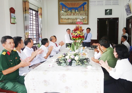 Phó Bí thư Thường trực Tỉnh ủy- Bùi Văn Nghiêm (phải) tặng hoa và quà chúc mừng Ban Đại diện Hội thánh Tin lành Việt Nam (miền Nam) tỉnh Vĩnh Long. Ảnh Báo Vĩnh Long |
