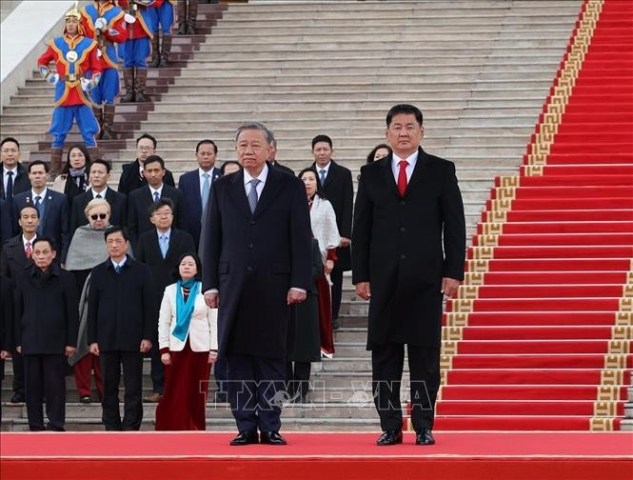 Tổng thống Mông Cổ, Ukhnaagiin Khurelsukh đón Tổng Bí thư, Chủ tịch nước Tô Lâm tại nơi đỗ xe. Thiếu nhi Mông Cổ tặng hoa Tổng Bí thư, Chủ tịch nước Tô Lâm. Sau đó, Tổng thống Mông Cổ Ukhnaagiin Khurelsukh mời Tổng Bí thư, Chủ tịch nước Tô Lâm cùng bước lên bục danh dự. Quân nhạc cử Quốc thiều Việt Nam và Quốc thiều Mông Cổ. Tiếp đó, Tổng thống Ukhnaagiin Khurelsukh mời Tổng Bí thư, Chủ tịch nước Tô Lâm cùng duyệt đội danh dự. Tổng Bí thư, Chủ tịch nước Tô Lâm đã ký sổ “Khách danh dự”, với nội dung ghi lưu bút sổ “Khách danh dự” tại Cung Nhà nước Mông Cổ: “Việt Nam- Mông Cổ đã đi qua chặng đường tròn 70 năm với những thành tựu hợp tác phát triển quan trọng.