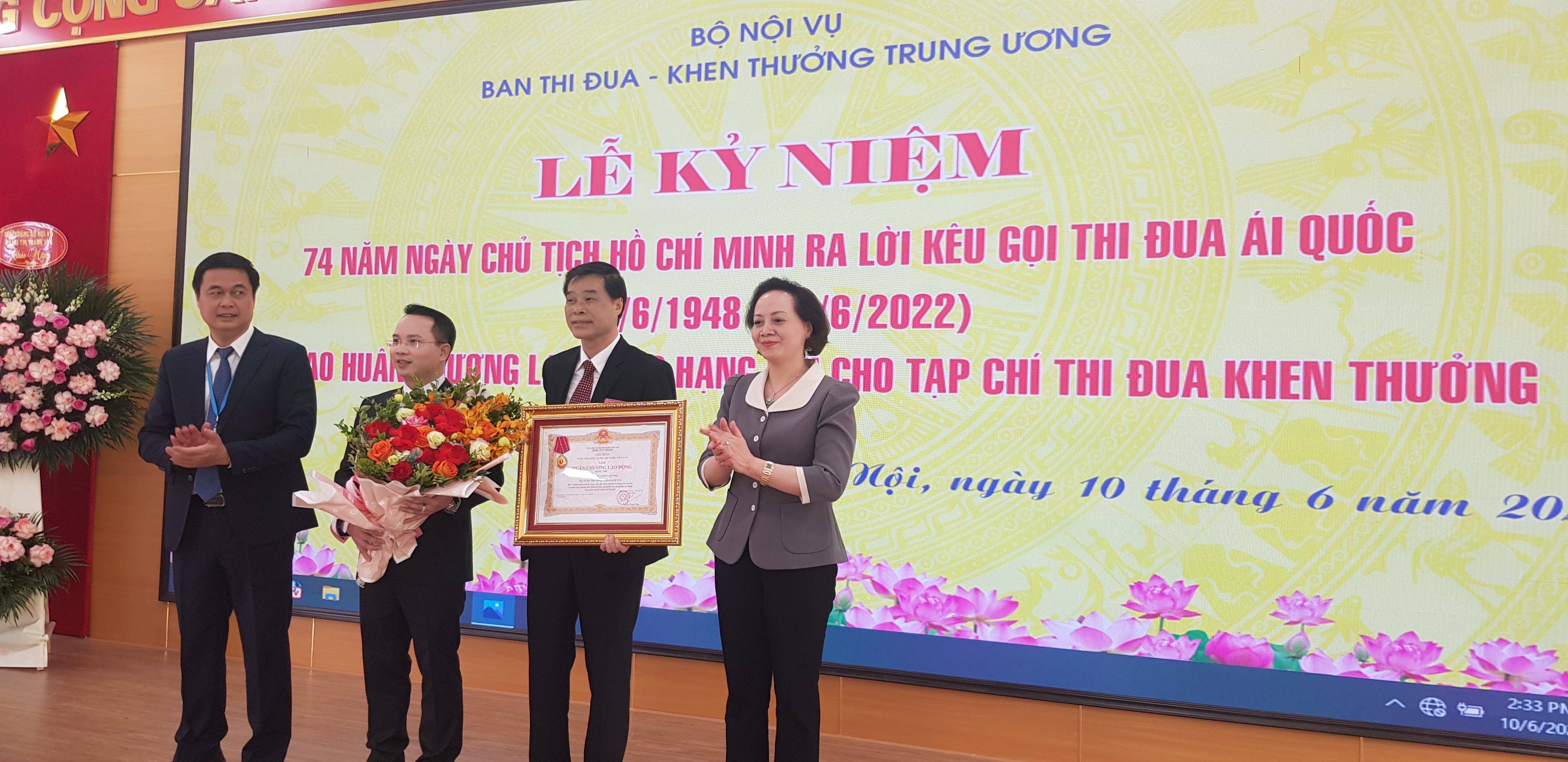 Tại lễ kỷ niệm, Bộ trưởng Bộ Nội vụ, Phó Chủ tịch Thường trực Hội đồng Thi đua - Khen thưởng Trung ương Phạm Thị Thanh Trà trao Huân chương Lao động hạng Nhì cho Tạp chí Thi đua khen thưởng.