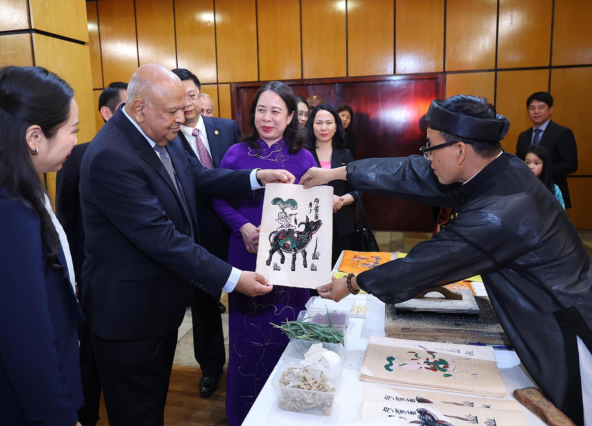 Phó Chủ tịch nước Võ Thị Ánh Xuân cùng Bộ trưởng Bộ Doanh nghiệp công Nam Phi Pravin Gordhan tìm hiểu nghệ thuật tranh dân gian Đông Hồ tại Không gian văn hóa Việt Nam. Ảnh: Lâm Khánh/TTXVN |