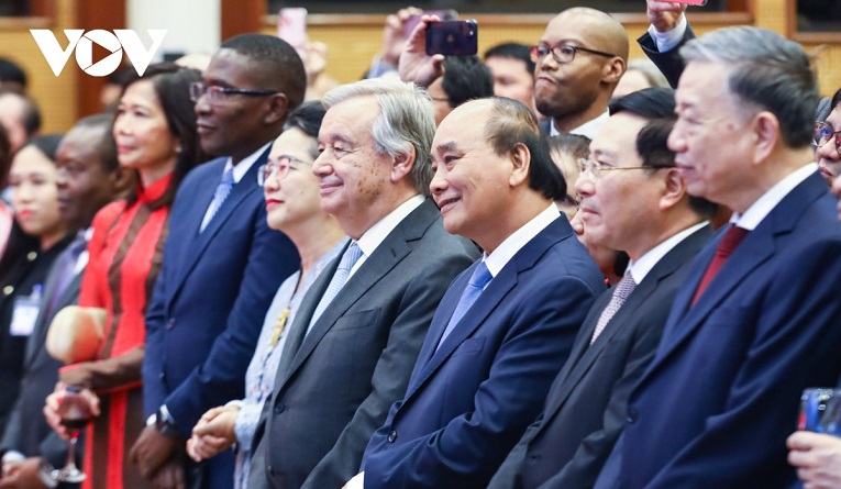 Chủ tịch nước Nguyễn Xuân Phúc, Tổng thư ký Liên Hợp Quốc António Guterres và các đại biểu dự Lễ kỷ niệm 45 năm Việt Nam gia nhập Liên Hợp Quốc tại Hà Nội (20/9/1977 – 20/9/2022). Ảnh: VOV |