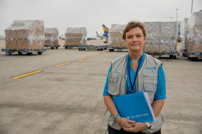 Bà Rana Flower, Trưởng đại diện UNICEF tại Việt Nam đứng trước chuyến hàng 811.200 liều vắc xin COVID-19 đầu tiên do COVAX hỗ trợ vào ngày 1/4/2021 tại Cảng Hàng không Quốc tế Nội Bài. Ảnh: UNICEF Việt Nam\Trương Việt Hùng |