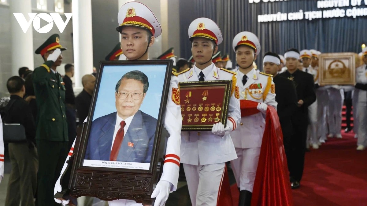 Nghi thức rước ảnh nguyên Chủ tịch nước Trần Đức Lương, bắt đầu lễ di quan. Ảnh: VOV |