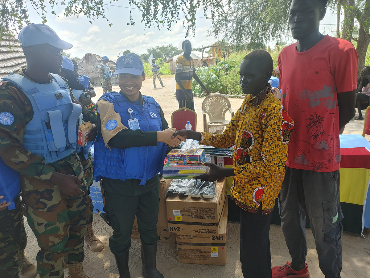 Các sĩ quan gìn giữ hoà bình Việt Nam thực hiện chương trình “đồng hành cùng cộng đồng”, tặng quà cho người dân địa phương Cộng hòa Nam Sudan. Ảnh: Đơn vị cảnh sát Gìn giữ Hoà bình số 1 |