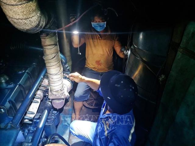Nhân viên Trung tâm Dịch vụ Hậu cần - Kỹ thuật đảo Sinh Tồn (Trường Sa) khắc phục sự cố tại máy chính tàu cá. Ảnh: TTXVN |
