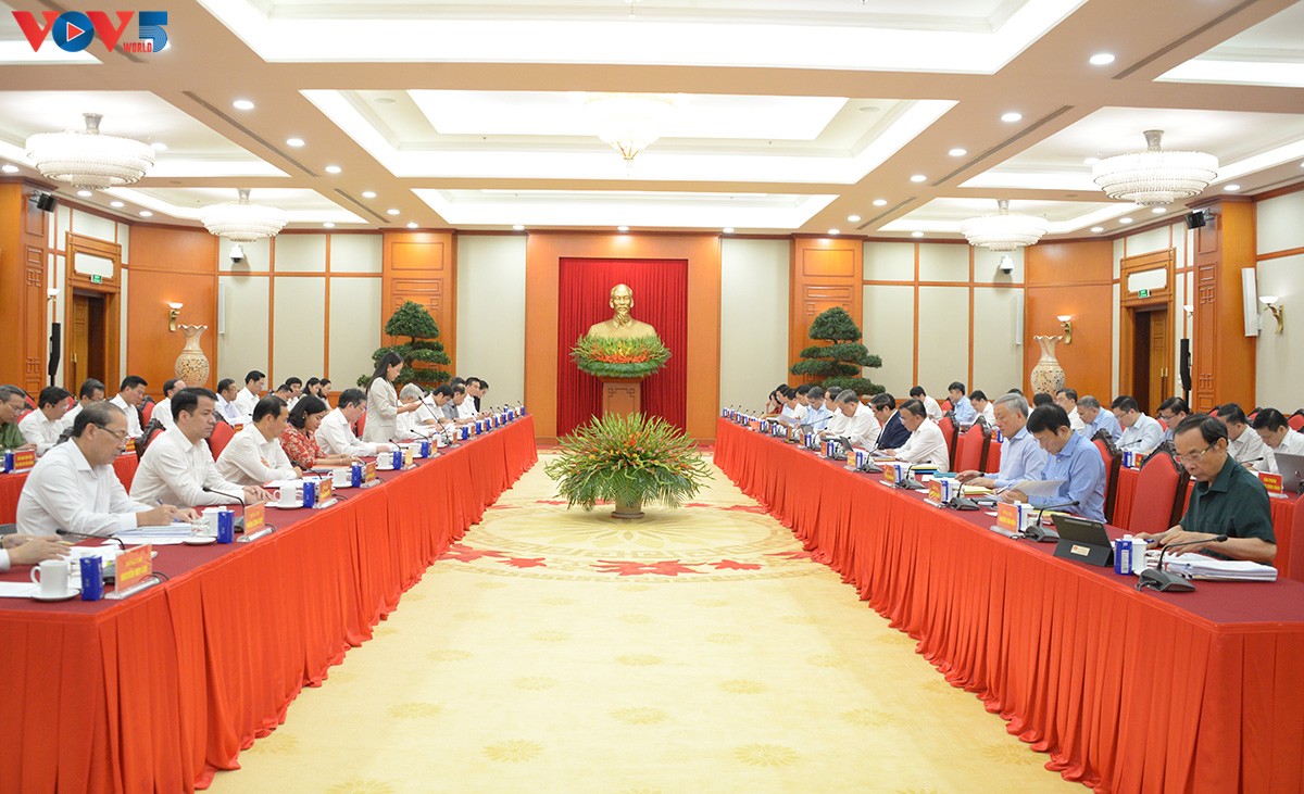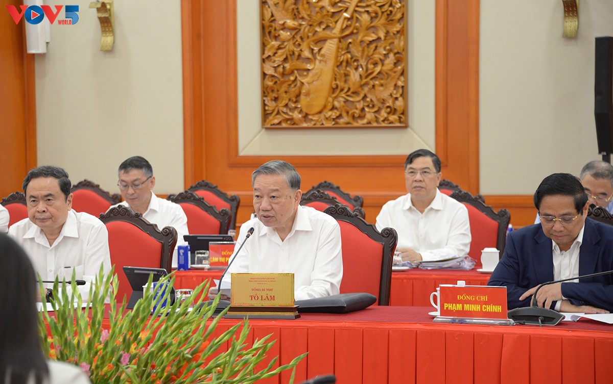 Tổng Bí thư Tô Lâm chủ trì cuộc làm việc của Bộ Chính trị với Ban Thường vụ Đảng uỷ Mặt trận Tổ quốc, các đoàn thể Trung ương. Ảnh: Văn Hiếu/VOV |
