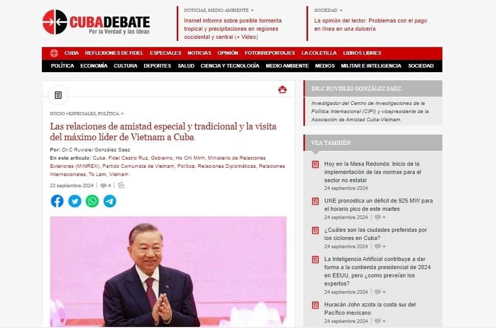 Truyền thông Cuba nhận định chuyến thăm cấp Nhà nước của Tổng Bí thư, Chủ tịch nước Tô Lâm đến Cuba sẽ tạo động lực quan trọng cho tình anh em giữa hai dân tộc. Trong bài viết đăng tải mới đây trên báo điện tử CubaDebate, trang thông tin chính thống có lượng truy cập lớn nhất đảo quốc Caribe, Tiến sĩ Ruvislei González Sáez, Phó Chủ tịch Hội Hữu nghị Cuba - Việt Nam, nêu bật ý nghĩa của chuyến thăm và khẳng định việc Tổng Bí thư, Chủ tịch nước Tô Lâm thăm Cuba sẽ mở ra chương mới trong lịch sử quan hệ song phương.