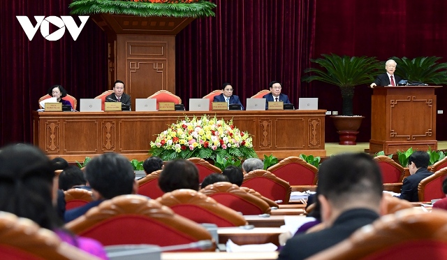 Tổng Bí thư Nguyễn Phú Trọng phát biểu tại Hội nghị lần thứ 8 Ban chấp hành Trung ương Đảng khoá XIII. Ảnh: VOV |