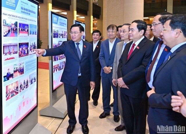 Chủ tịch Quốc hội Vương Đình Huệ và các đại biểu tham quan triển lãm ảnh về công tác đối ngoại của Quốc hội. Ảnh: Báo Nhân dân |