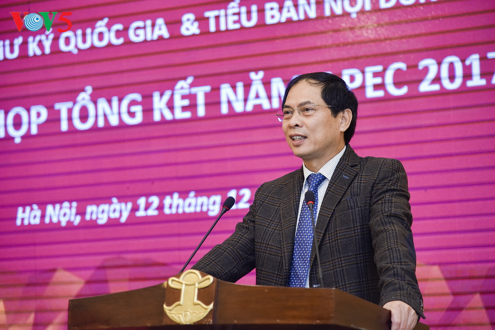 Phát biểu tại đây, Thứ trưởng thường trực Bộ Ngoại giao Bùi Thanh Sơn, Phó Chủ tịch Ủy ban Quốc gia APEC 2017, Trưởng Ban Thư ký Quốc gia APEC 2017, khẳng định những thành công và bài học trong Năm APEC 2017 đặt ra nhiều việc cần làm trong thời gian tới để tạo đà vững chắc cho các bước đi tiếp theo trên con đường hội nhập nói chung và trong tham gia APEC nói riêng.