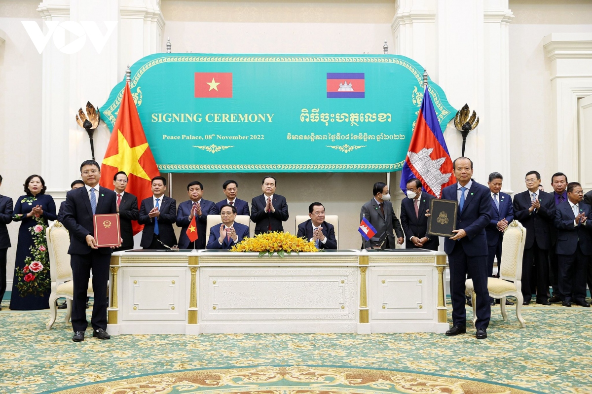 Thủ tướng hai nước chứng kiến lễ ký Thỏa thuận về hợp tác truyền thanh và truyền hình giai đoạn 2022-2025 giữa Đài Tiếng nói Việt Nam và Bộ Thông tin Campuchia. Ảnh: VOV |