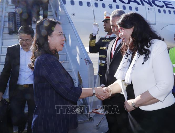 Các đại biểu đón Phó Chủ tịch nước Võ Thị Ánh Xuân tại sân bay quốc tế Djerba.Ảnh: Lâm Khánh - TTXVN |