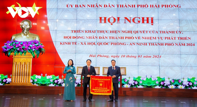 Phó Chủ tịch nước Võ Thị Ánh Xuân thay mặt lãnh đạo Đảng, Nhà nước trao Cờ thi đua của Chính phủ cho thành phố Hải Phòng . Ảnh: VOV |