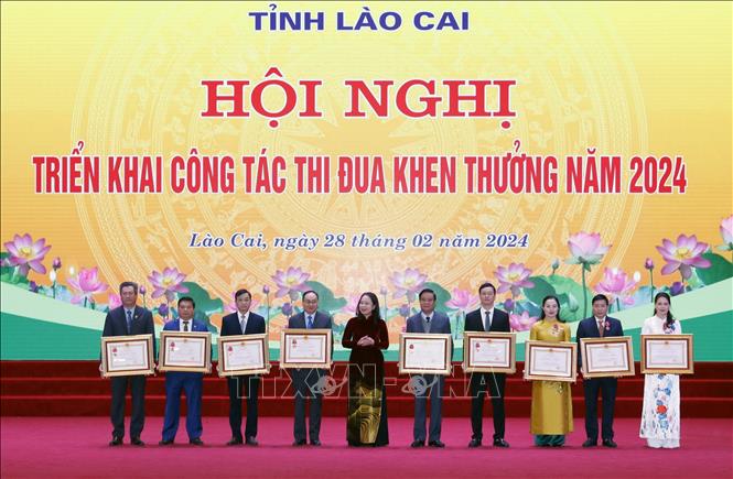 Tại đây, bà Võ Thị Ánh Xuân đã trao Huân chương Độc lập hạng Ba cho Hội Liên hiệp phụ nữ Việt Nam tỉnh Lào Cai và Huân chương Lao động các hạng Nhất, Nhì, Ba cho 5 tập thể, 4 cá nhân xuất sắc trong phong trào thi đua năm 2023.