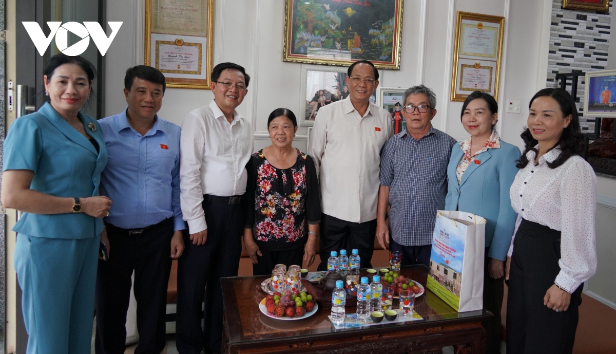 Phó Chủ tịch Quốc hội Trần Quang Phương (thứ 4 từ phải qua) tặng quà gia đình chính sách tại huyện Tây Sơn, tỉnh Bình Định. Ảnh: VOV |