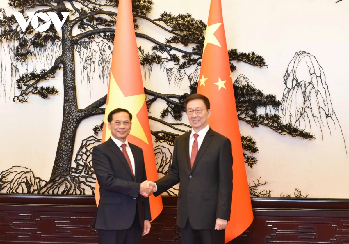 Phó Thủ tướng, Bộ trưởng Ngoại giao Bùi Thanh Sơn (trái) hội kiến Phó Chủ tịch Trung Quốc Hàn Chính. Ảnh: PV/VOV-Bắc Kinh |
