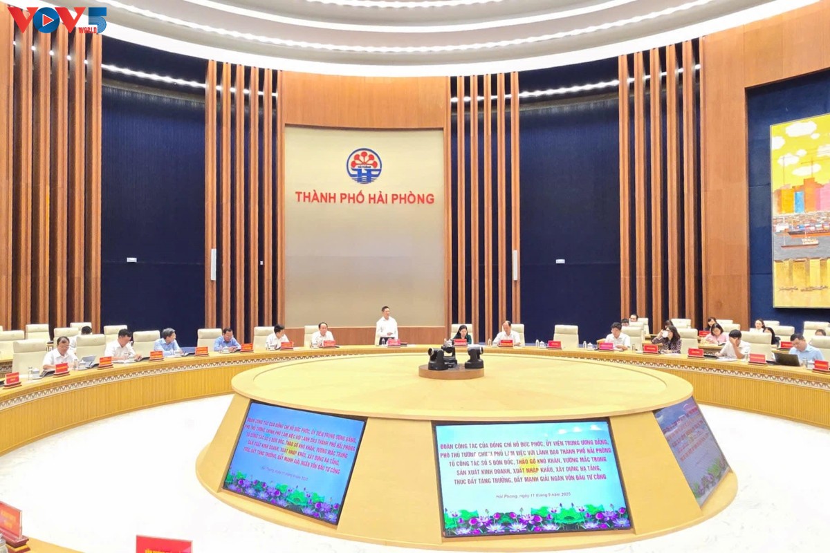 Đoàn công tác của Chính phủ do Phó Thủ tướng Chính phủ Hồ Đức Phớc làm trưởng đoàn làm việc với TP. Hải Phòng chiều ngày 11/9. Ảnh: Đàm Thanh/VOV |