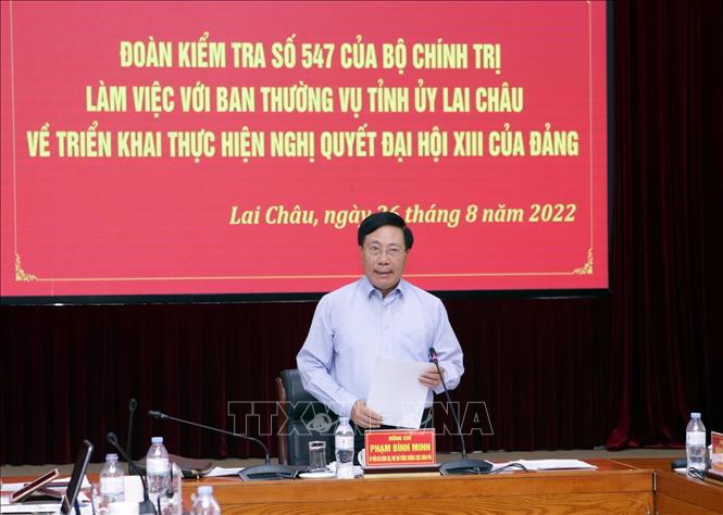 Phó Thủ tướng Thường trực Chính phủ Phạm Bình Minh đánh giá cao những kết quả mà Đảng bộ, nhân dân các dân tộc Lai Châu đạt được sau hơn một năm triển khai thực hiện Nghị quyết Đại hội lần thứ XIII của Đảng; đồng thời cho rằng, việc triển khai thực hiện Nghị quyết Đại hội XIII của Đảng tại địa phương rất nhanh chóng, toàn diện. Mặc dù xuất phát điểm còn khó khăn, song tốc độ phát triển hồi phục kinh tế tại địa phương rất ấn tượng; nhiều chỉ số cải cách hành chính tăng bậc tích cực...