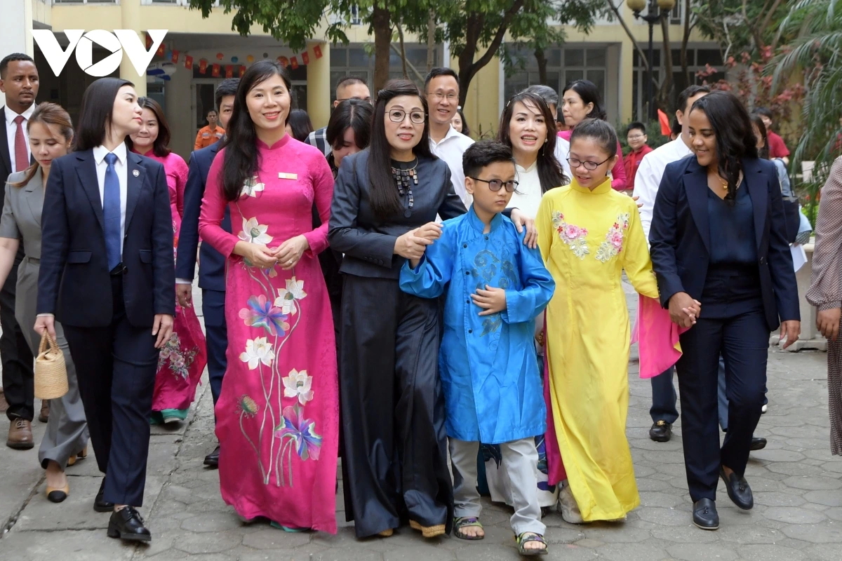 Phu nhân Lê Thị Bích Trân và Phu nhân Thủ tướng Ethiopia Zinash Tayachew tới thăm trường Trường PTCS Nguyễn Đình Chiểu (quận Hai Bà Trưng), ngôi trường dạy hòa nhập học sinh không khuyết tật với học sinh khiếm thị duy nhất tại Hà Nội. Ảnh: VOV |
