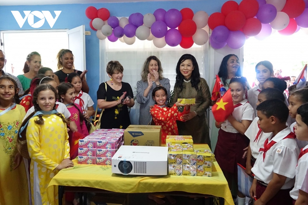 Trò chuyện với giáo viên và các học sinh tại ngôi trường mang tên nữ chiến sĩ cách mạng anh hùng Việt Nam Võ Thị Thắng, Phu nhân Ngô Phương Ly nhấn mạnh ngôi trường mang tên nữ anh hùng của Việt Nam là thể hiện sinh động về mối quan hệ thủy chung và tình cảm đặc biệt đó giữa hai dân tộc. Phu nhân mong rằng nhà trường tiếp tục nối tiếp truyền thống, kế thừa sự nghiệp Cách mạng của các thế hệ đi trước, không ngừng vun đắp cho mối quan hệ đoàn kết, thủy chung Việt Nam - Cuba. Nhân dịp này, Phu nhân Ngô Phương Ly đã gửi tặng nhà trường và các cháu học sinh một số thiết bị giảng dạy, đồ dùng học tập.