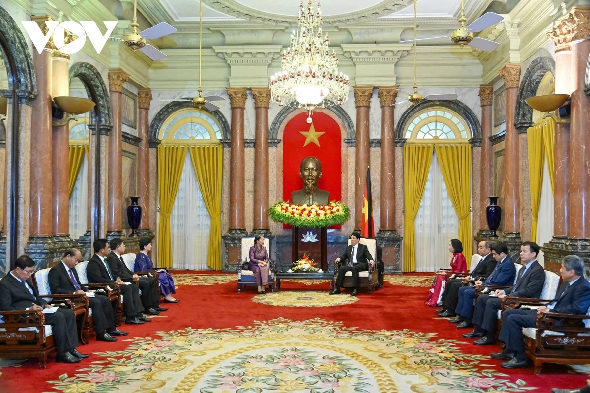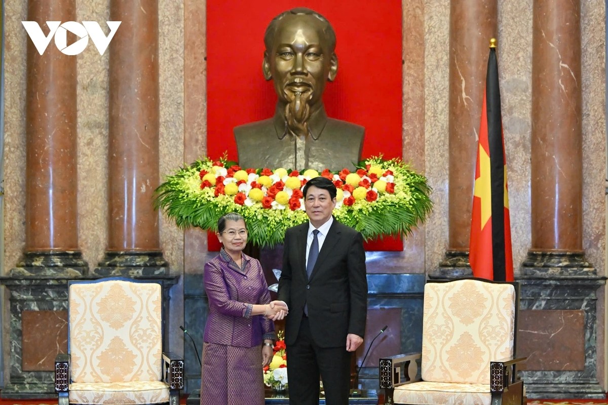 Chủ tịch nước Lương Cường tiếp bà Men Sam On, Phó Chủ tịch Đảng Nhân dân Campuchia, Chủ tịch Hội đồng quốc gia Mặt trận đoàn kết phát triển Tổ quốc Campuchia, Chủ tịch Hội hữu nghị Campuchia - Việt Nam. Ảnh: Việt Cường/VOV |