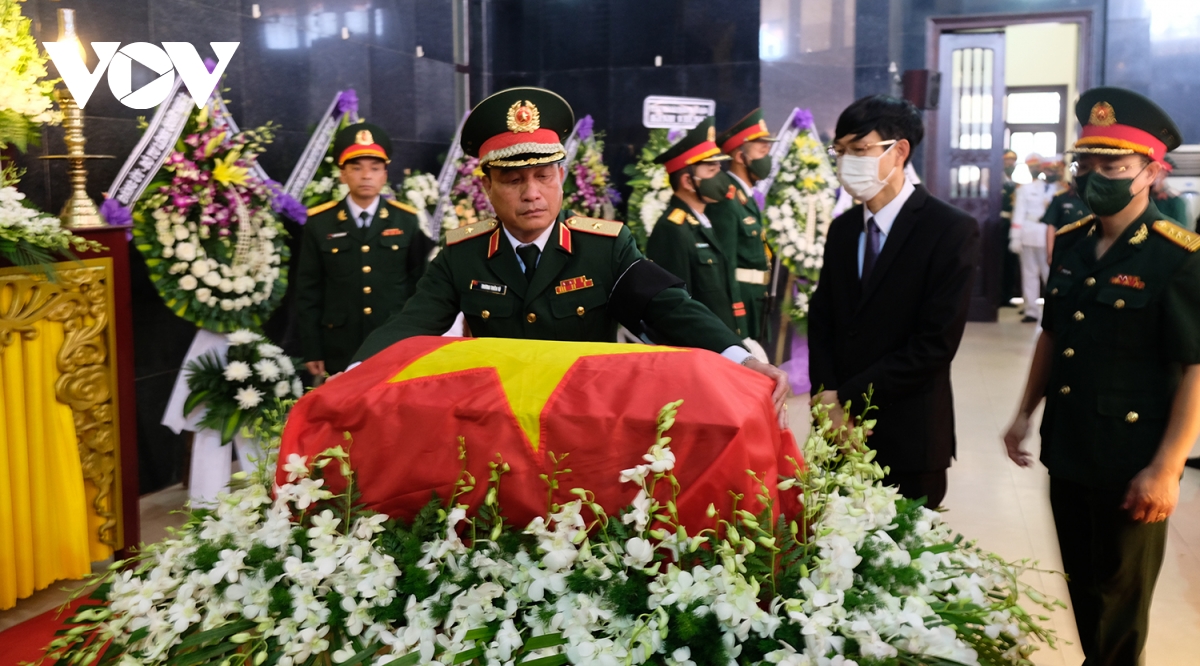 Thiếu tướng Trương Thiên Tô, Phó Chính ủy Quân khu 5, Trưởng Ban Tang lễ, chỉnh lại Quốc kỳ phủ trên linh cữu Anh hùng Kostas Nguyễn Văn Lập. Ảnh: VOV |