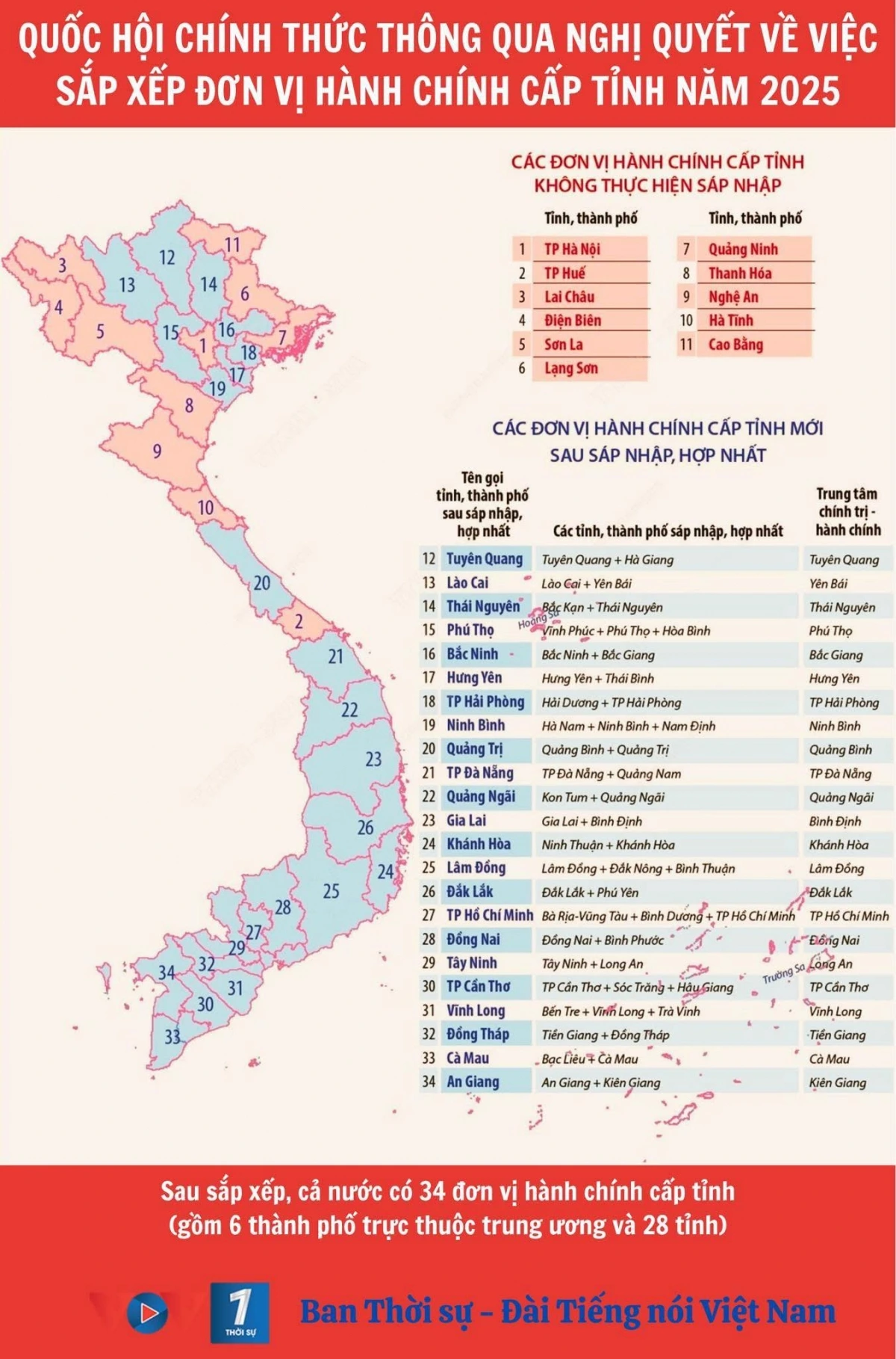 Kể từ ngày Nghị quyết này có hiệu lực thi hành, cả nước có 34 đơn vị hành chính cấp tỉnh, gồm 28 tỉnh và 6 thành phố; trong đó có 19 tỉnh và 4 thành phố hình thành sau sắp xếp quy định tại nghị quyết này và 11 tỉnh, thành phố không thực hiện sắp xếp là các tỉnh: Cao Bằng, Điện Biên, Hà Tĩnh, Lai Châu, Lạng Sơn, Nghệ An, Quảng Ninh, Thanh Hoá, Sơn La và thành phố Hà Nội, thành phố Huế.