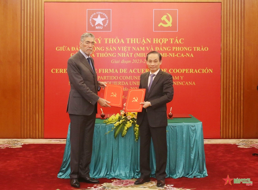 Trong khuôn khổ chuyến thăm và làm việc tại Việt Nam của Đoàn đại biểu Đảng Phong trào Cánh tả Thống nhất (MIU), Cộng hòa Dominica, sáng nay tại Trụ sở Ban Đối ngoại Trung ương, Trưởng Ban Đối ngoại Trung ương Lê Hoài Trung và ông Miguel Mejia, Tổng Bí thư Đảng MIU, thay mặt hai đảng ký Thỏa thuận hợp tác giai đoạn 2023 - 2028.