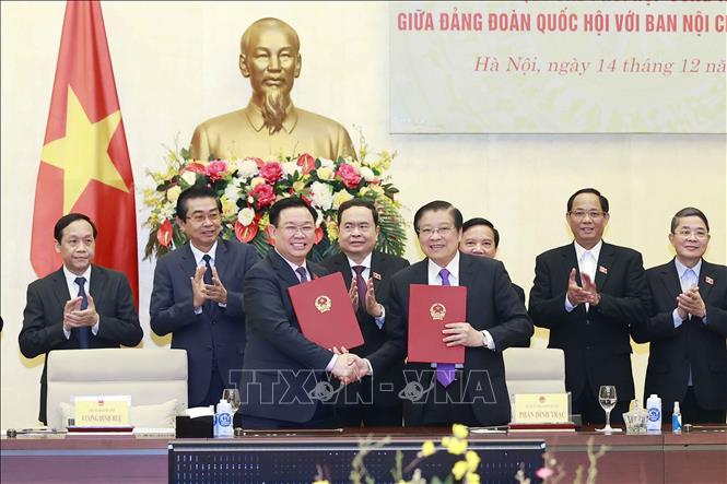 Chiều nay (14/12), tại Nhà Quốc hội, Chủ tịch Quốc hội Vương Đình Huệ và Trưởng Ban Nội chính Trung ương Phan Đình Trạc tham dự Lễ ký quy chế phối hợp công tác giữa Đảng đoàn Quốc hội với Ban Nội chính Trung ương.