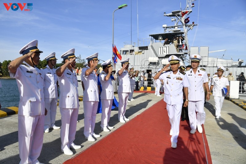 Lễ đón đoàn công tác Căn cứ biển Hải quân Hoàng gia Campuchia tại quân cảng Vùng 5 Hải quân Nhân dân Việt Nam. Ảnh: VOV |