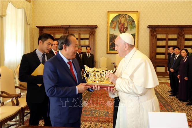 Phó Thủ tướng thường trực Trương Hòa Bình thông báo với Giáo hoàng về các thành tựu kinh tế - xã hội và hội nhập quốc tế nổi bật gần đây của Việt Nam và nhấn mạnh đây là kết quả nỗ lực của mọi người dân Việt Nam, trong đó có đóng góp quan trọng của cộng đồng các tôn giáo Việt Nam.