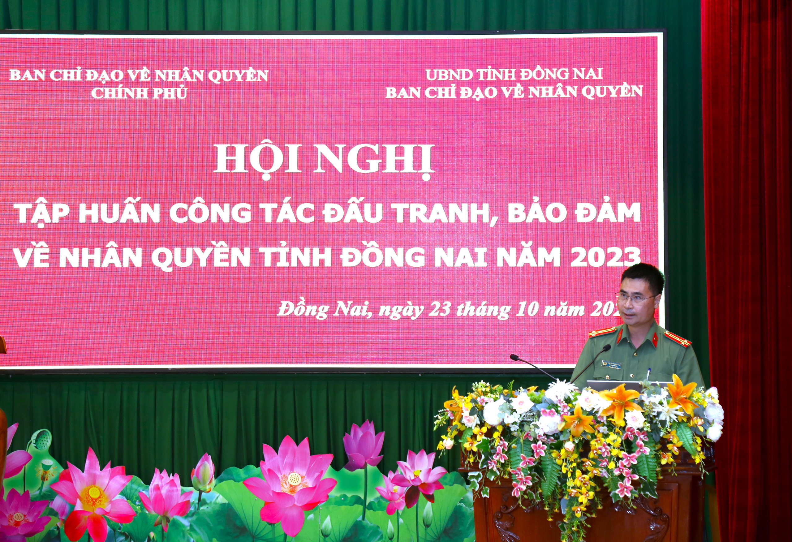 Hội nghị tập huấn công tác đấu tranh, bảo đảm về nhân quyền tỉnh Đồng Nai năm 2023 diễn ra hôm nay (23/10), tại tỉnh Đồng Nai. Hội nghị do Ban Chỉ đạo về nhân quyền tỉnh Đồng Nai, Văn phòng Thường trực Ban Chỉ đạo nhân quyền phối hợp tổ chức.